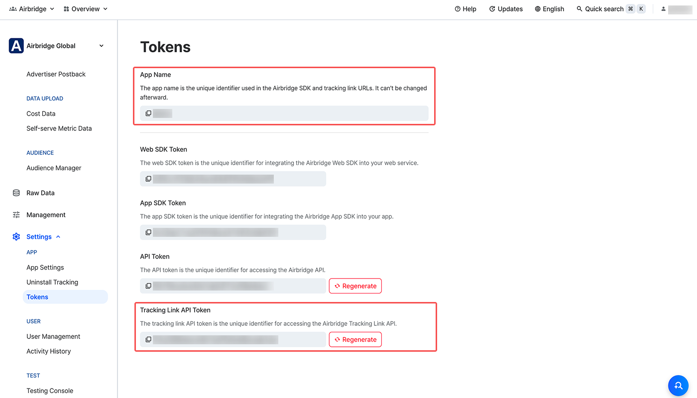 The App Name and Tracking Link API Token can be found on the [Settings]>[Tokens] page. You can copy the values by clicking on them.