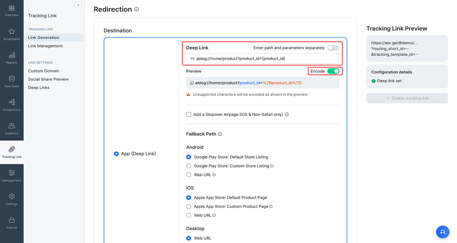 The desktop fallback URL must be encoded when added. Otherwise, the tracking link won’t work as intended. If you want to send users to different destinations using a dynamic parameter, read this section.