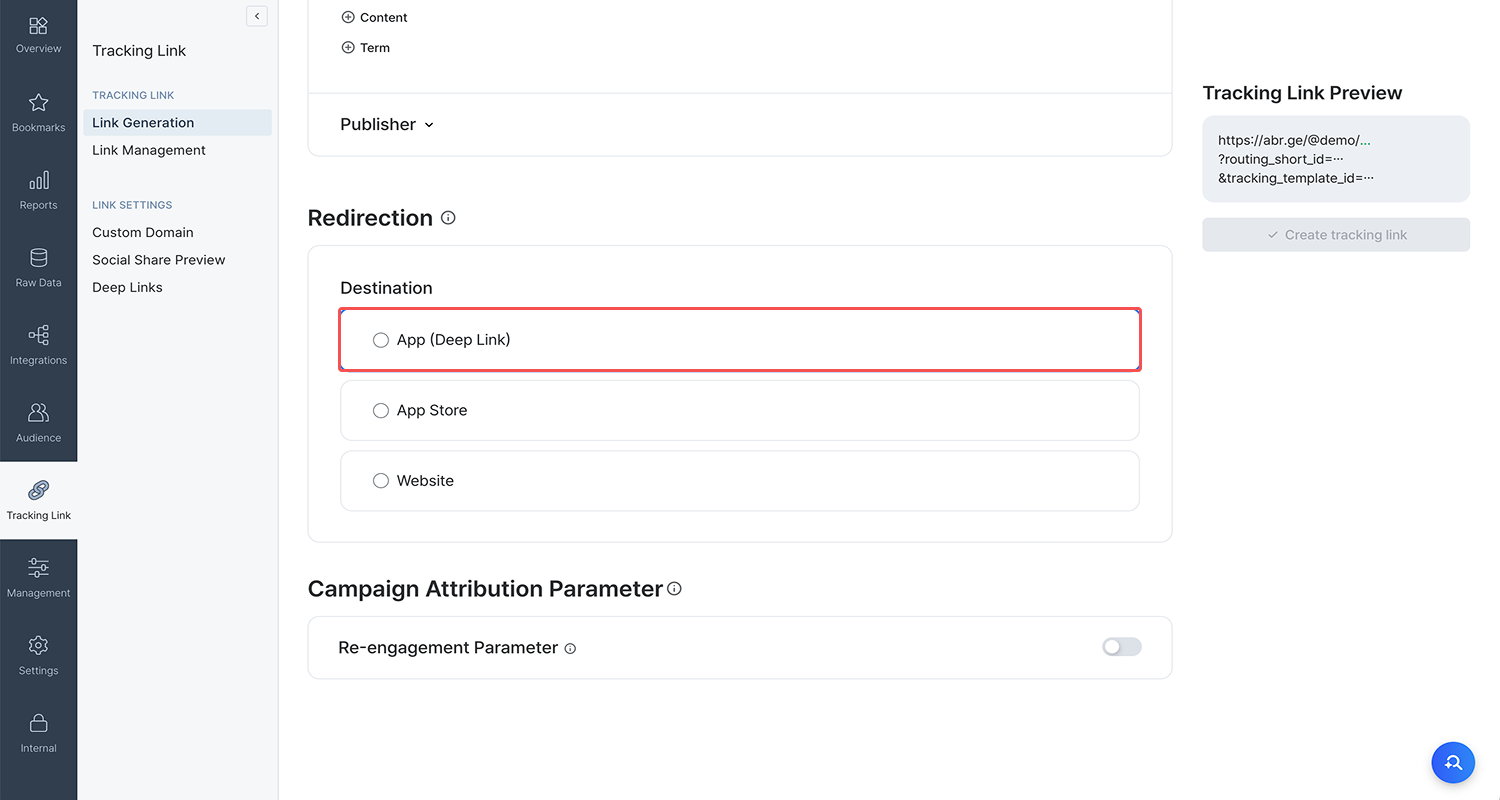 1. Go to [Tracking Link]>[Link Generation]>[Redirection], and select App (Deep Link) as [Destination].
