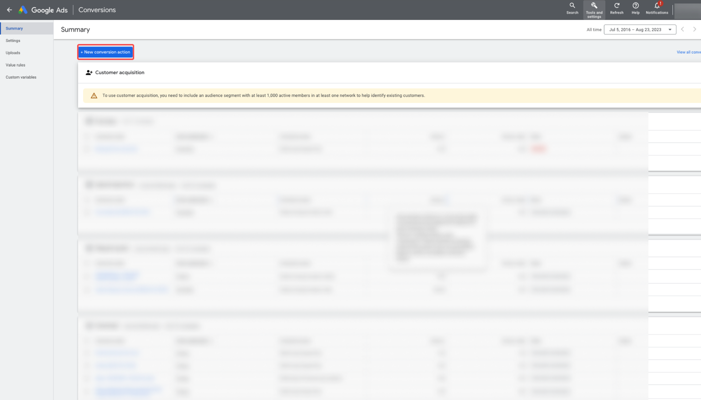 1. Navigate to [Goals]>[Conversions]>[Summary] and click View all conversion actions.