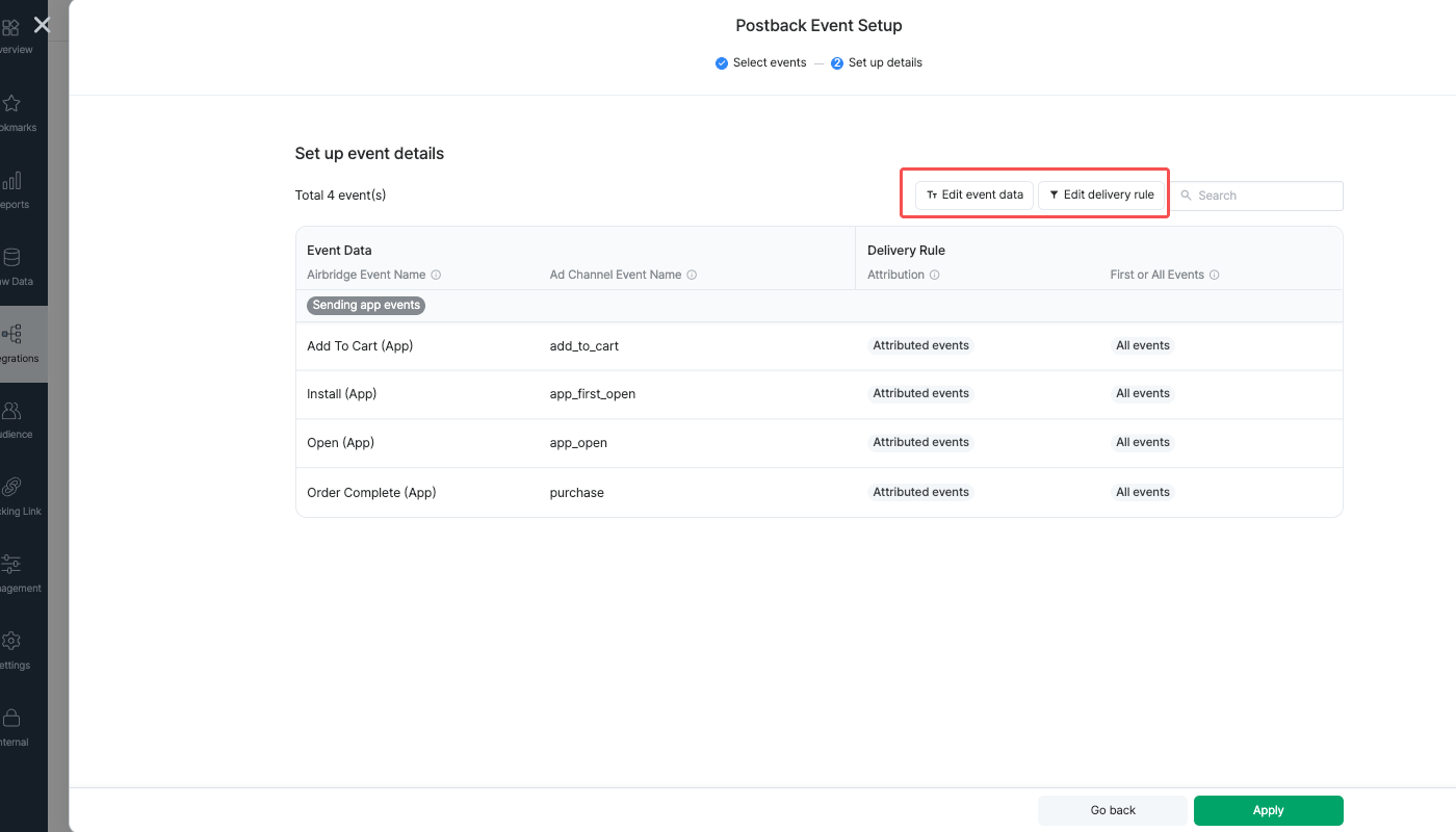You can send event postbacks to the ad channels integrated with Airbridge. Airbridge offers a settings page where you can select the events to send and configure the delivery rules for postback sending.