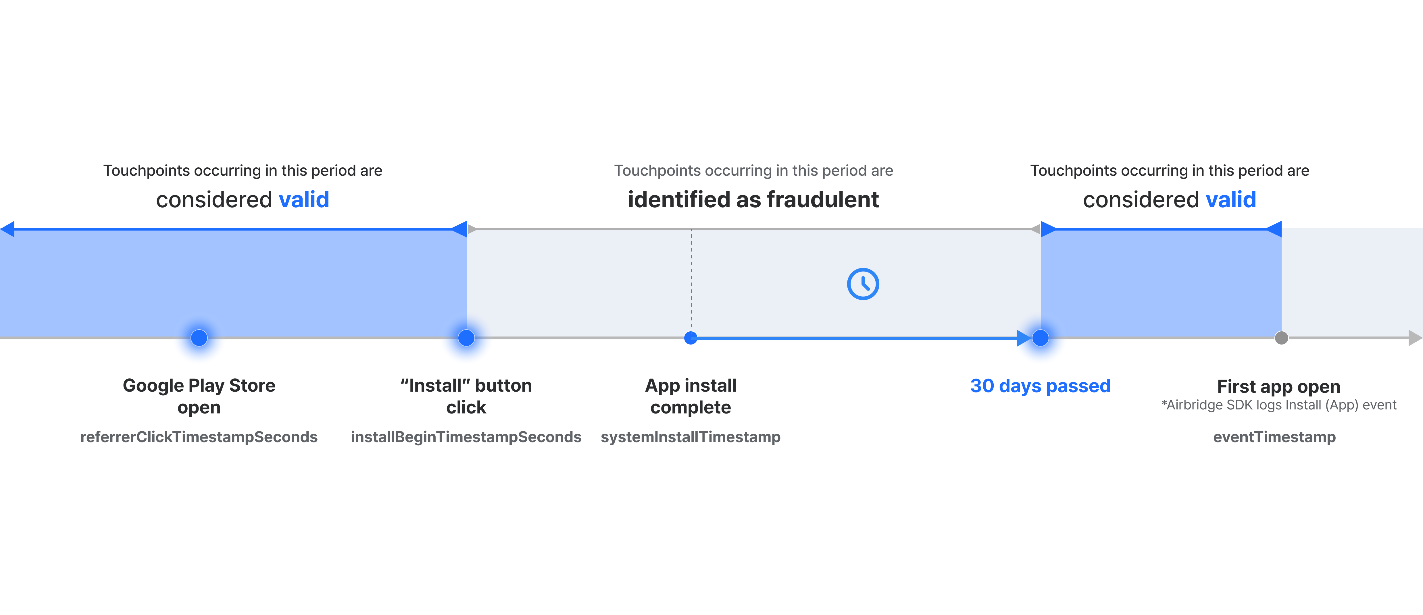 However, touchpoints occurring more than 30 days after installation is completed are not identified as fraudulent. This is because if a user installs the app but doesn’t open it for an extended period, then opens it for the first time after a new touchpoint occurs, that touchpoint may have driven the user to open the app.