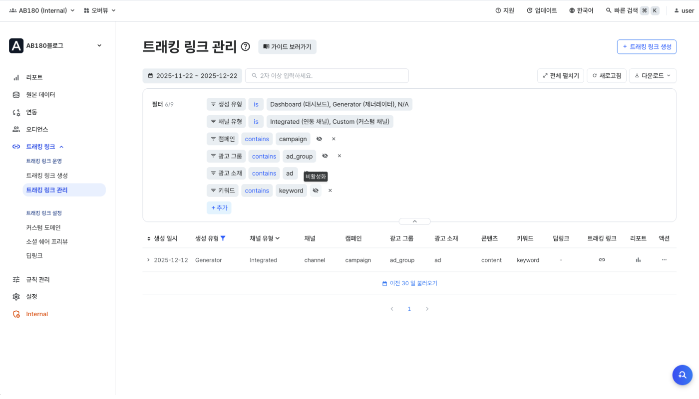 필터링 결과에는 입력한 필터 밸류가 포함된 모든 트래킹 링크가 나타납니다. 예를 들어, 필터 밸류로 ‘link'를 입력하면 promolink, facebook_link 처럼 ‘link’가 포함된 모든 트래킹 링크가 필터링 결과에 나타납니다.