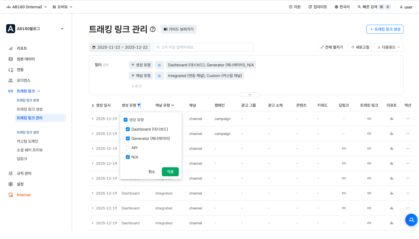 [트래킹 링크 관리]에서는 생성 타입과 채널 타입에 따라 트래킹 링크를 조회할 수 있습니다. 생성 타입에서는 대시보드, 제너레이터 템플릿, API, N/A를 여러 개 선택할 수 있습니다. API는 트래킹 링크 생성 API로 생성된 트래킹 링크이며, N/A는 2022년 12월 22일 이전에 생성된 트래킹 링크로 생성 타입을 표시할 수 없는 트래킹 링크입니다. 채널 타입에서는 연동 채널 또는 커스텀 채널을 선택할 수 있습니다.