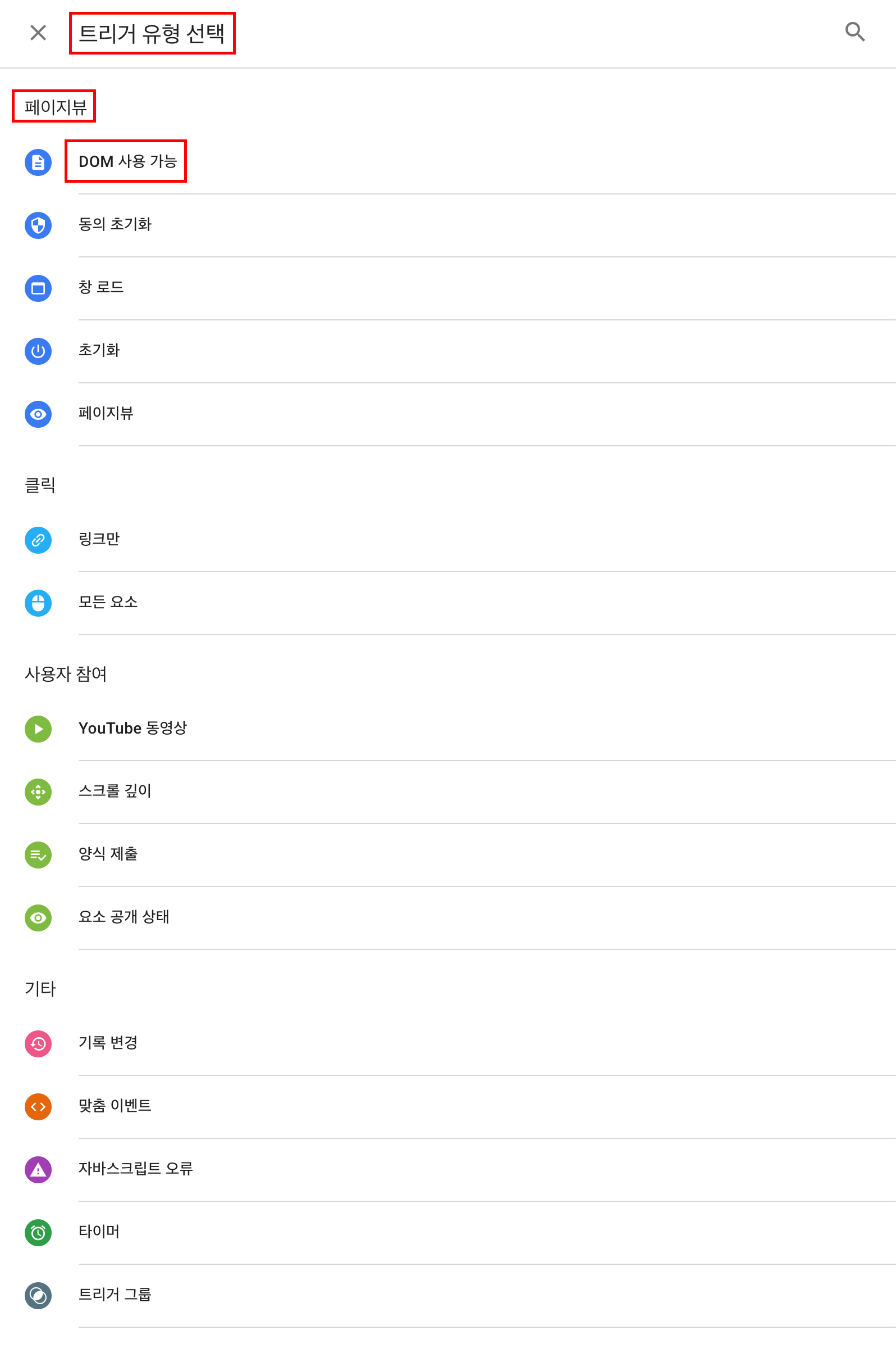 트리거를 클릭하여 유형이 DOM 사용 가능인 트리거를 선택해 주세요.