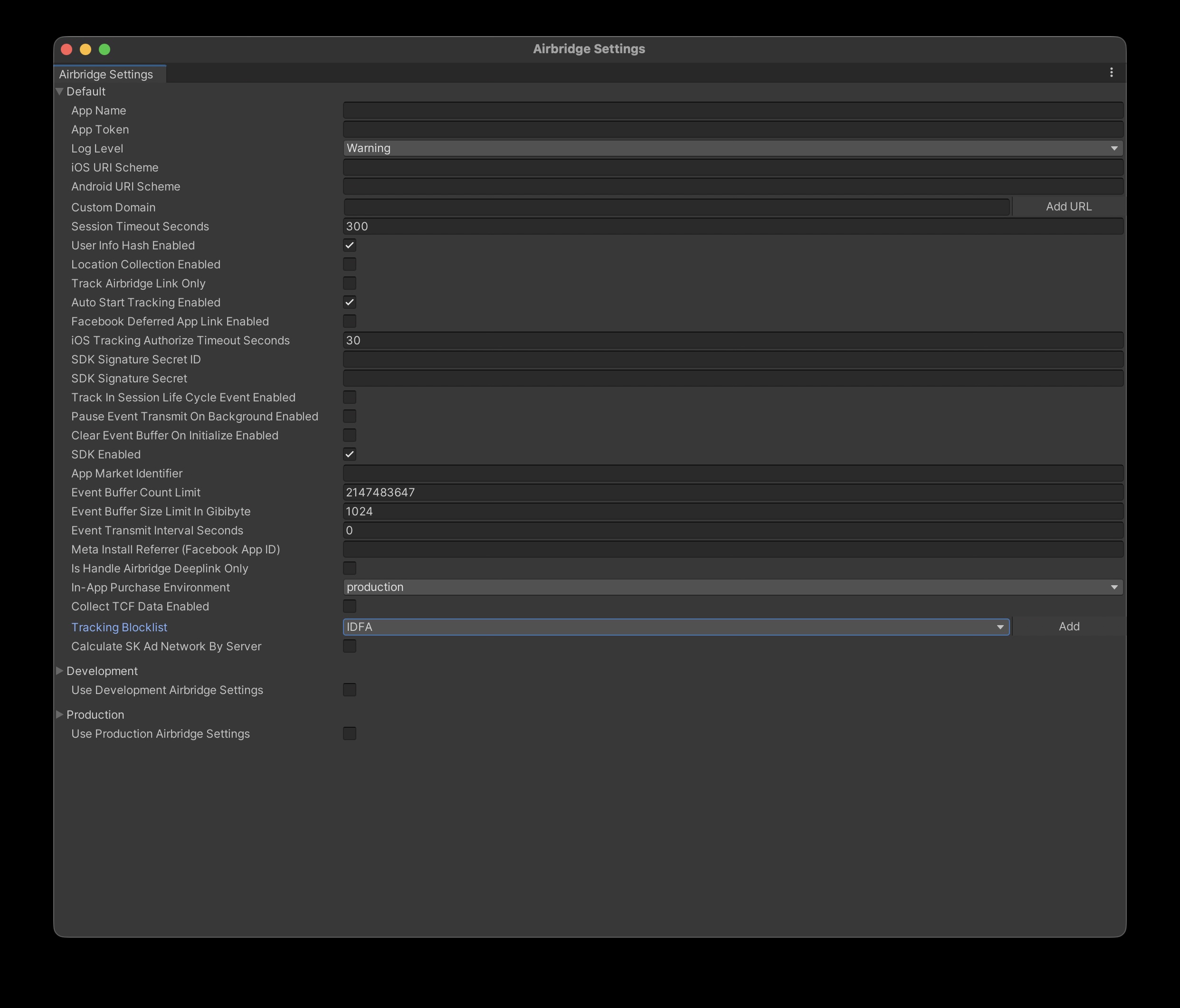 에어브릿지 유니티 SDK를 사용하기 위한 설정값을 입력합니다.