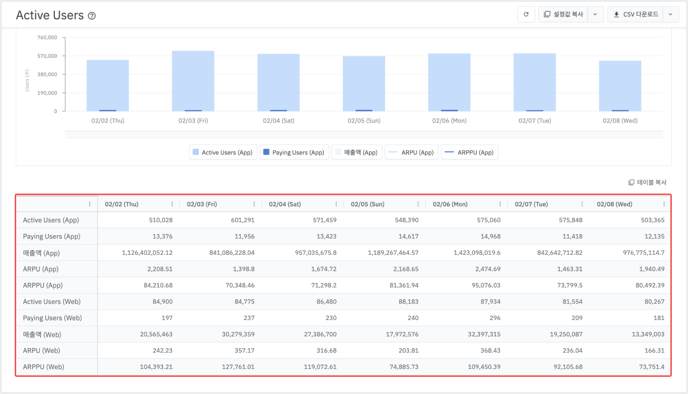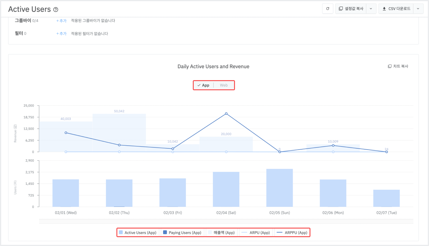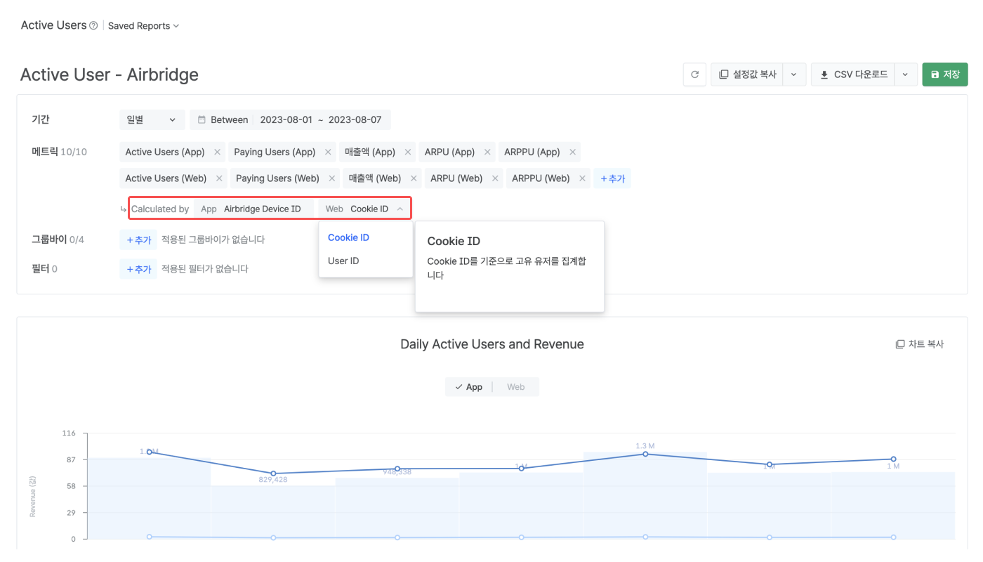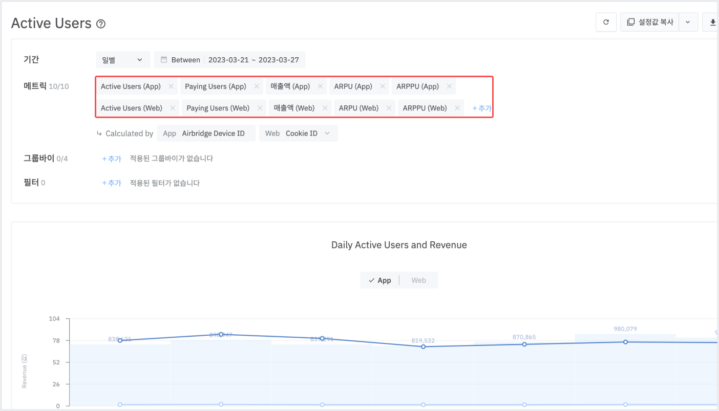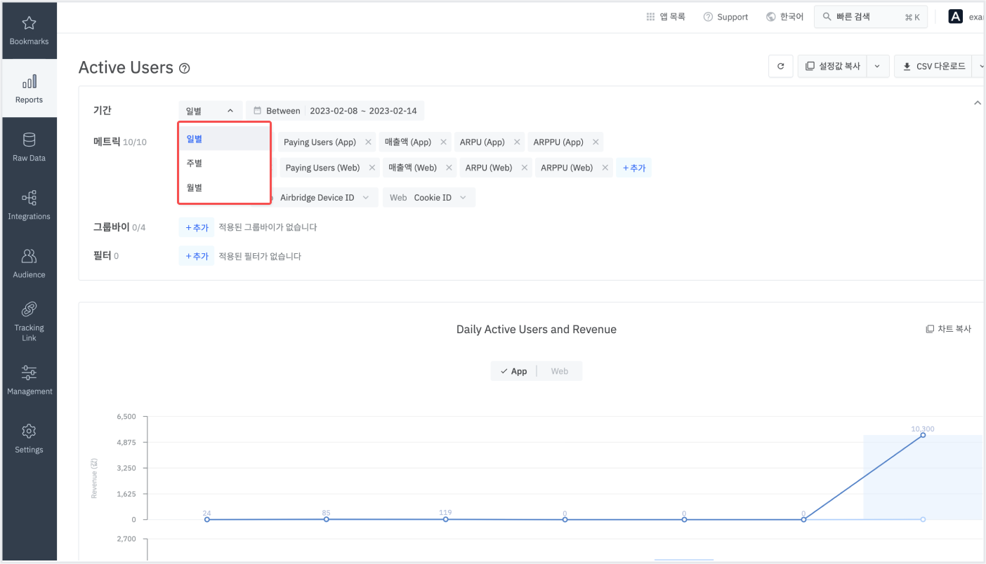 주기를 변경하면 메트릭으로 DAU, WAU를 확인할 수 있습니다. 자세한 내용은 에어브릿지 가이드를 참고해 주세요.