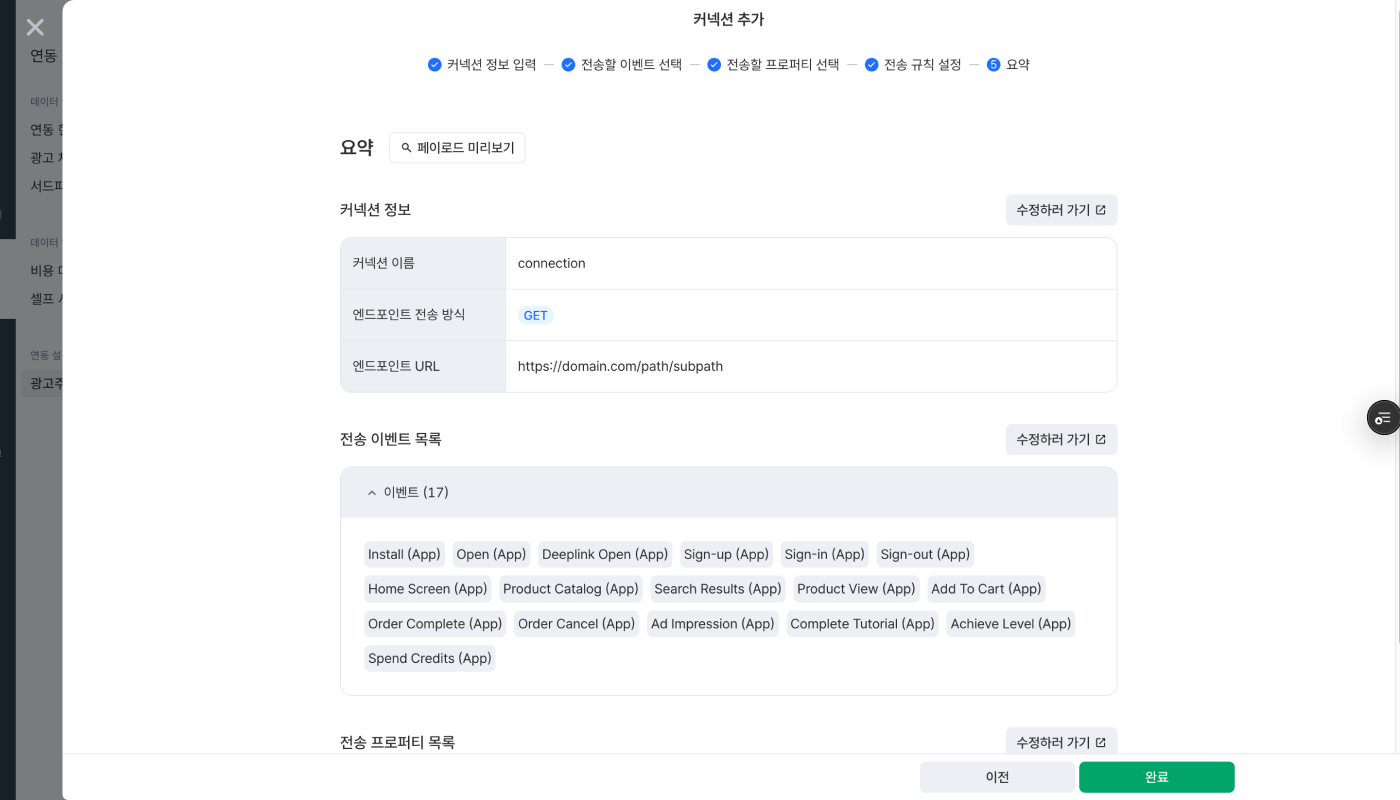 [요약]에서 추가할 커넥션의 정보를 확인합니다. ‘페이로드 미리보기’를 클릭해 포스트백으로 전송되는 데이터의 예시 페이로드를 확인하거나 복사할 수 있습니다. 그 다음 ‘완료’를 클릭합니다.