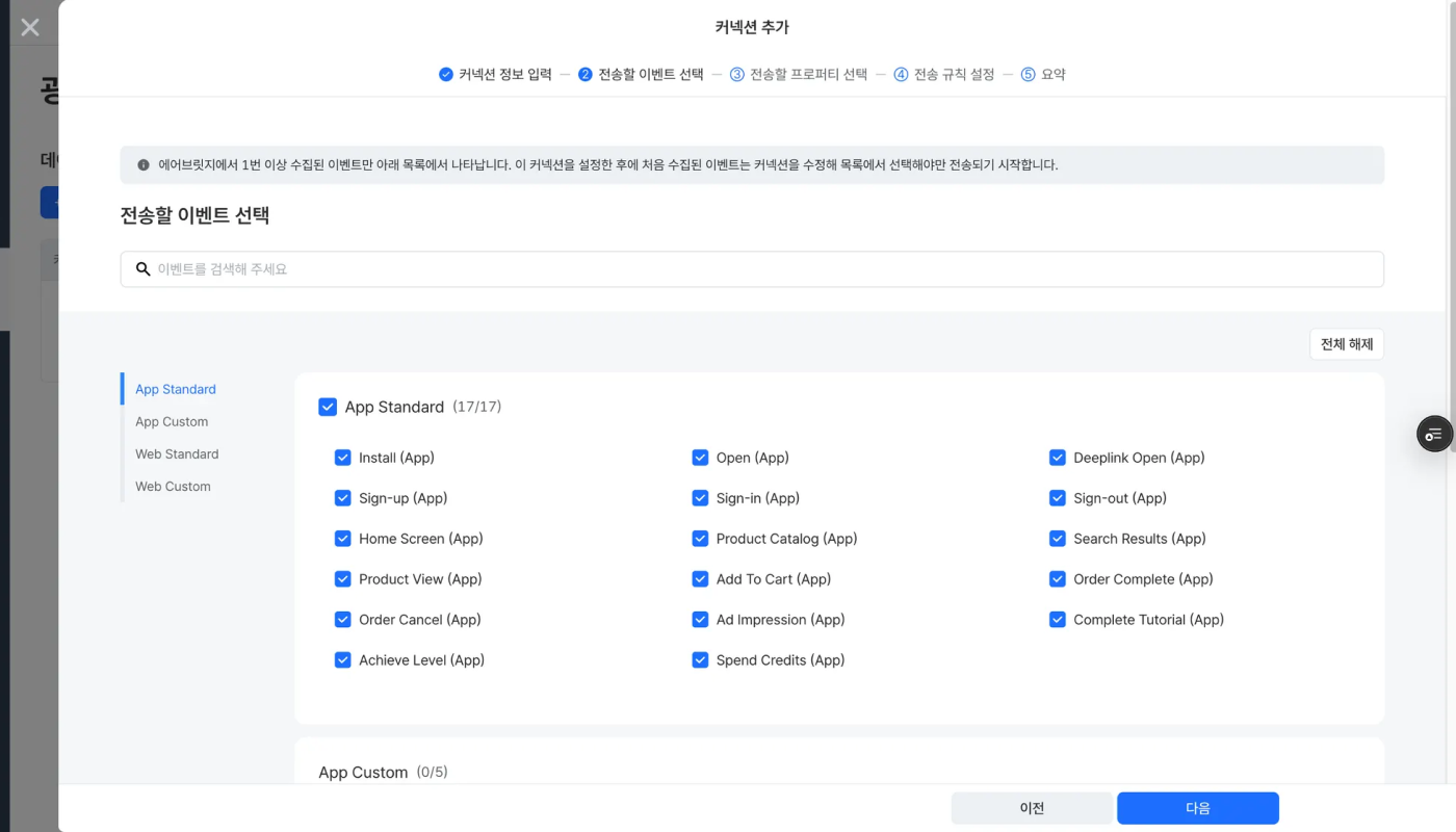 에어브릿지에서 엔드포인트로 전송할 이벤트를 선택합니다. 실제로 데이터가 수집된 이벤트만 노출됩니다.