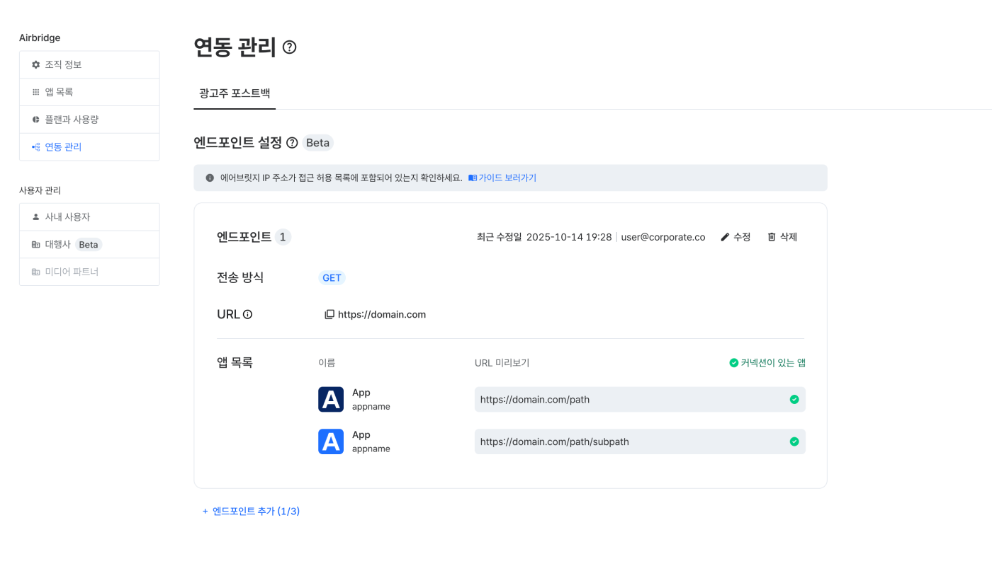 에어브릿지 대시보드 [조직]>[연동 관리]>[광고주 포스트백] 탭에서 엔드포인트를 추가하세요. 엔드포인트는 조직 단위로 추가됩니다. 정상 추가된 엔드포인트는 아래처럼 나타납니다.
