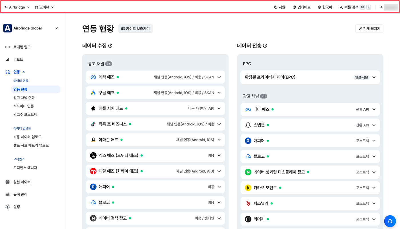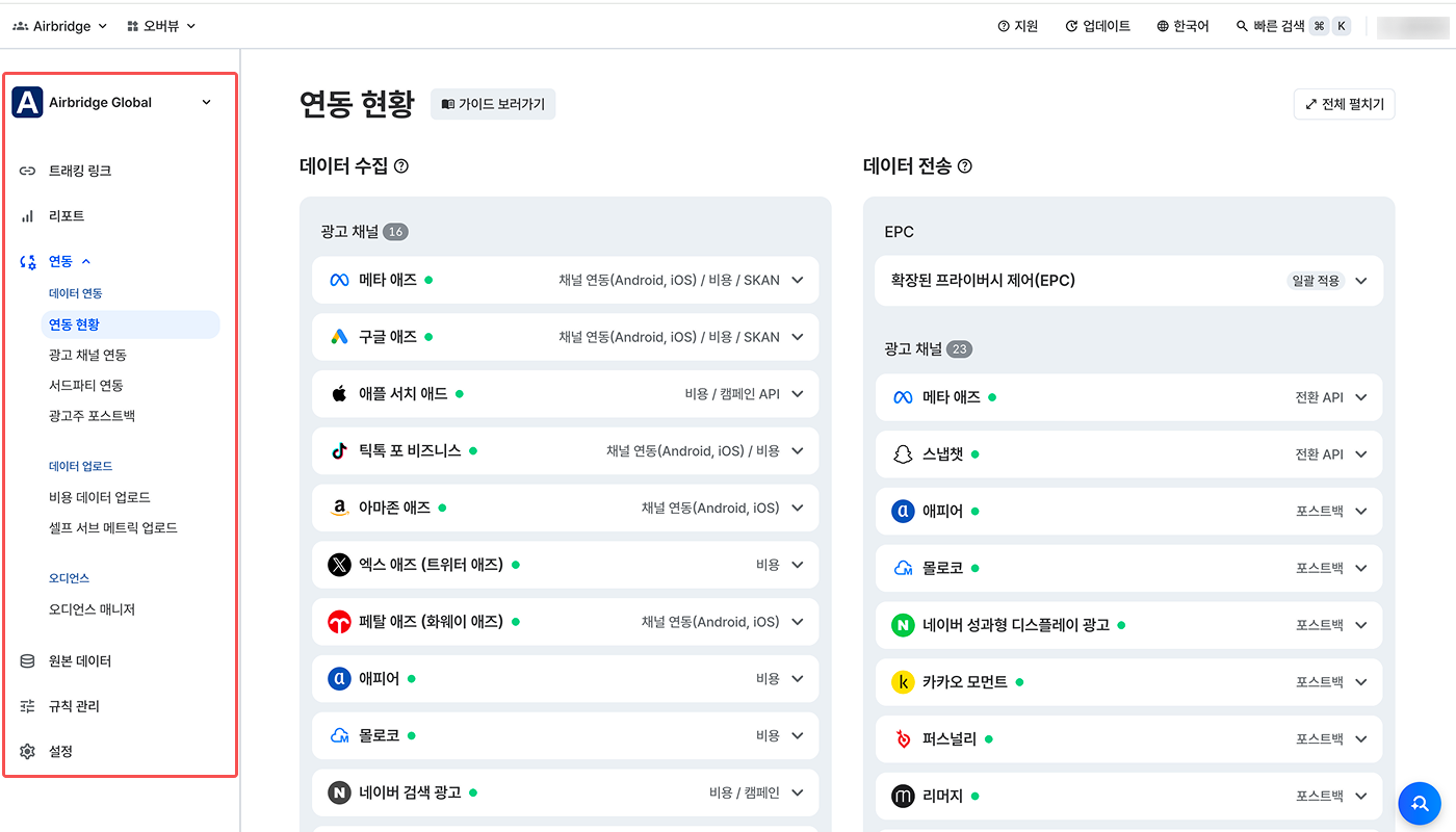 연동 | 에어브릿지와 광고 채널, 데이터 스토리지, 서드 파티 플랫폼을 연동할 수 있습니다. 오디언스를 설정하고 광고 채널에 전송할 수 있습니다. | - 에어브릿지와 연동하기 - 오디언스 공유하기 |