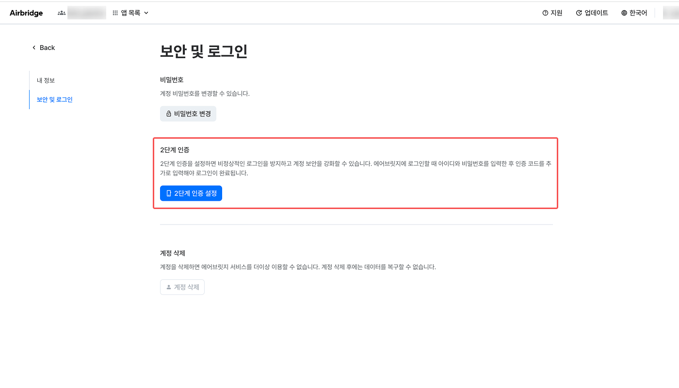 계정 정보 | 에어브릿지 사용자 계정 정보를 확인할 수 있습니다. 보안을 위해 2단계 인증(2FA)을 설정할 수 있습니다. 또한 에어브릿지에서 로그아웃을 할 수 있습니다. |