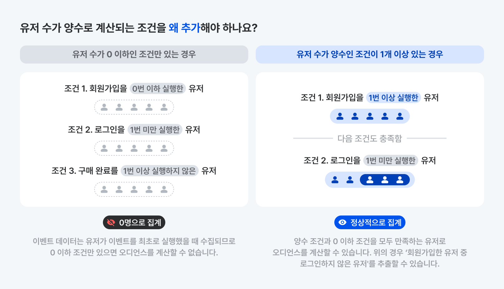 이때 유저 수가 양수인 조건을 1개 이상 추가하면 양수 조건과 0 이하 조건을 모두 만족하는 유저로 오디언스를 계산할 수 있습니다. 아래 이미지를 참고하세요.