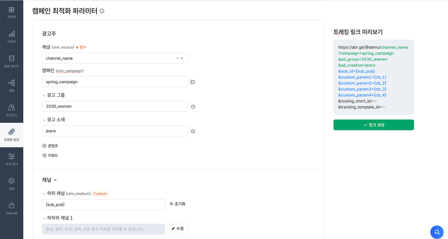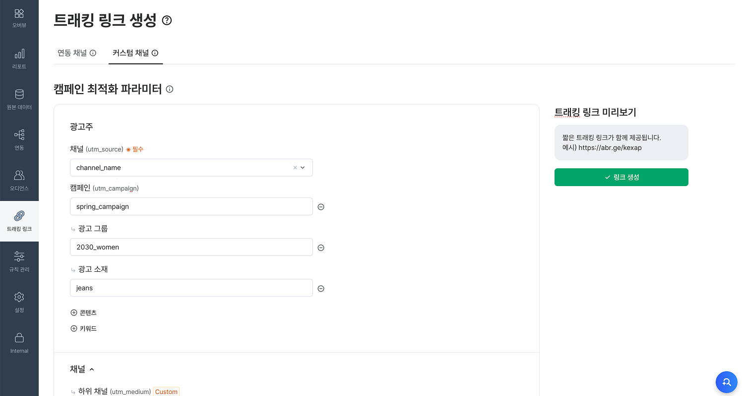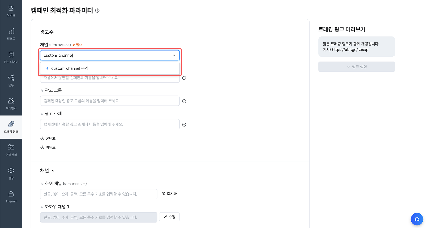 커스텀 채널용 트래킹 링크에서는 커스터마이즈 옵션을 설정할 수 있습니다.