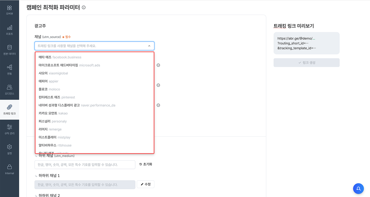 1. [캠페인 최적화 파라미터]>[광고주]에서 [채널]을 먼저 선택합니다. 채널은 필수 항목으로 반드시 선택해야 합니다. 선택한 채널에 따라 해당 채널에서 사용할 수 있는 트래킹 링크 형식을 [트래킹 링크 미리보기]에서 확인할 수 있습니다.