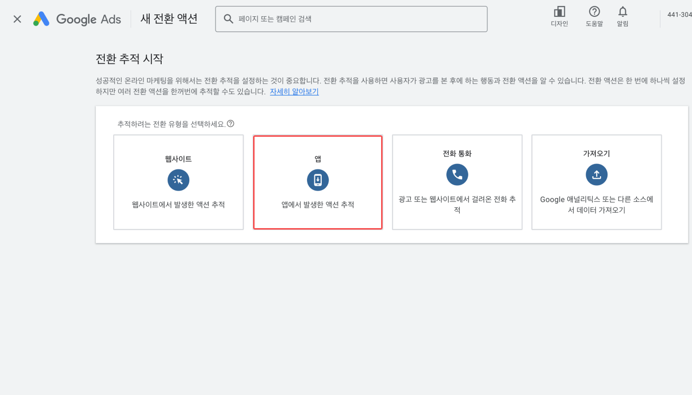 3. [전환 추적 시작]에서 '앱에서 발생한 액션 추적'을 클릭합니다.