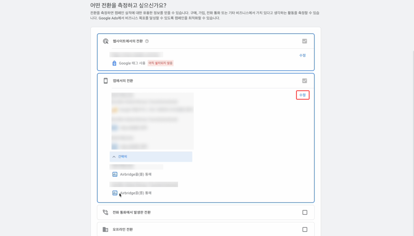 전환 액션으로 만든 에어브릿지 이벤트만 구글 애즈에서 확인할 수 있습니다. 전환 액션을 제대로 만들지 않았다면 원하는 데이터를 확인할 수 없습니다. 아래는 전환 액션을 다시 만들어야 하는 경우입니다.