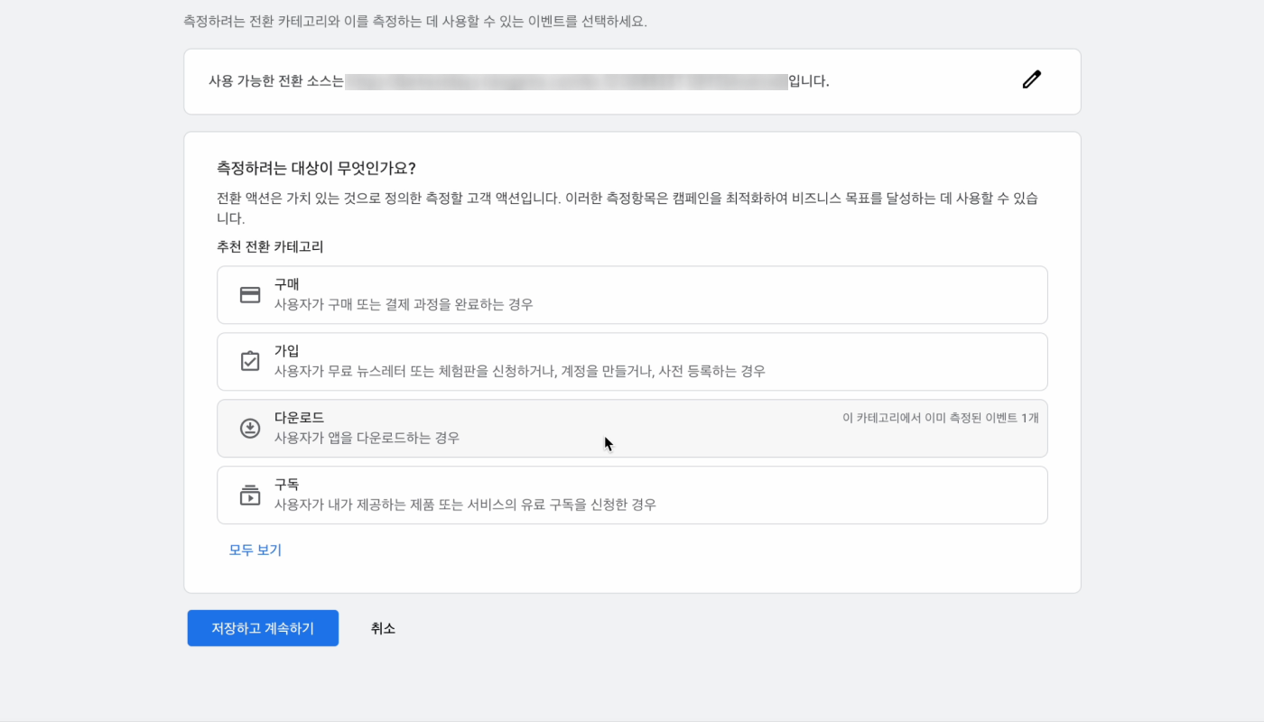 6. 구매, 가입, 다운로드, 구독 등 [추천 전환 카테고리]에서 전환 액션으로 측정하려는 대상을 선택합니다.