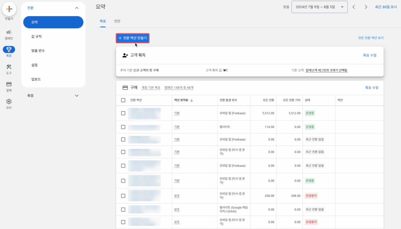 이처럼 해당 이벤트의 상태를 [운영중]으로 수정하면 구글 애즈 대시보드 [목표]>[전환]>[요약]에서 해당 이벤트를 확인할 수 있습니다.