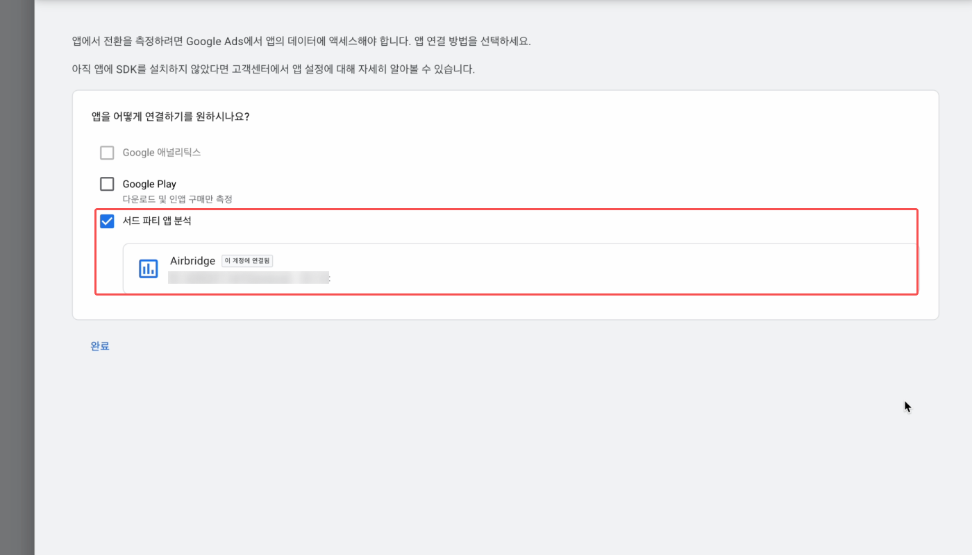 구글 애즈의 링크 ID를 플랫폼에 맞게 정확하게 입력해야 에어브릿지와 구글 애즈가 연동됩니다. 링크 ID를 다시 확인해 주세요.