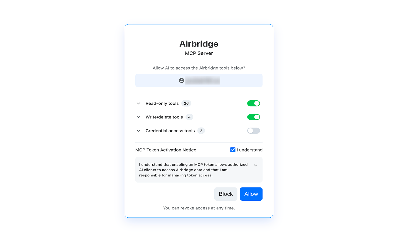이 토큰을 활성화하면 Model Context Protocol(MCP)을 통해 호환되는 AI 클라이언트가 Airbridge의 일부 데이터와 기능에 접근할 수 있습니다.