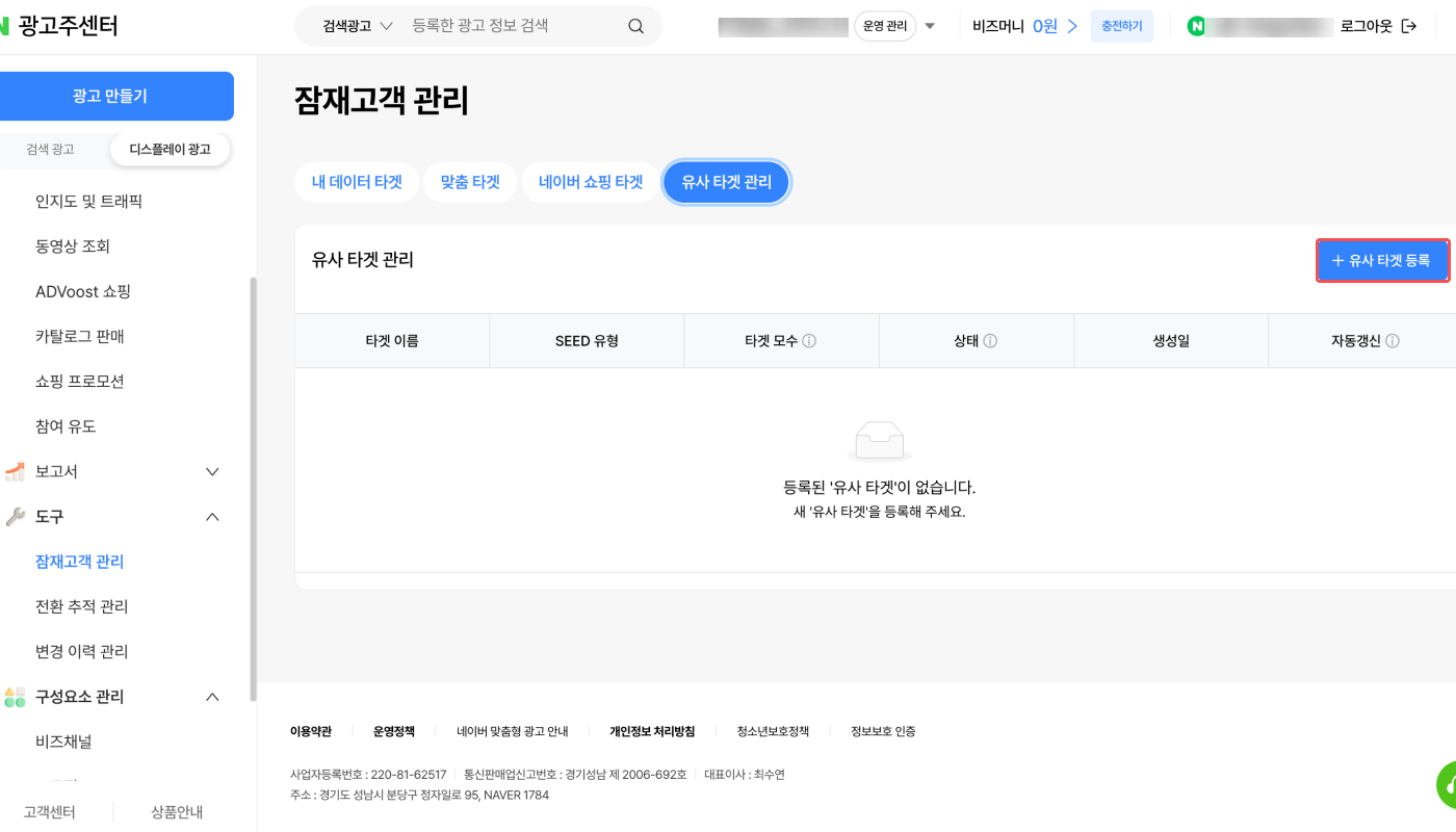 1. 네이버 성과형 디스플레이 광고 대시보드의 [도구]>[타겟 관리]>[유사 타겟 관리]에서 ‘유사 타겟 등록’을 클릭합니다.