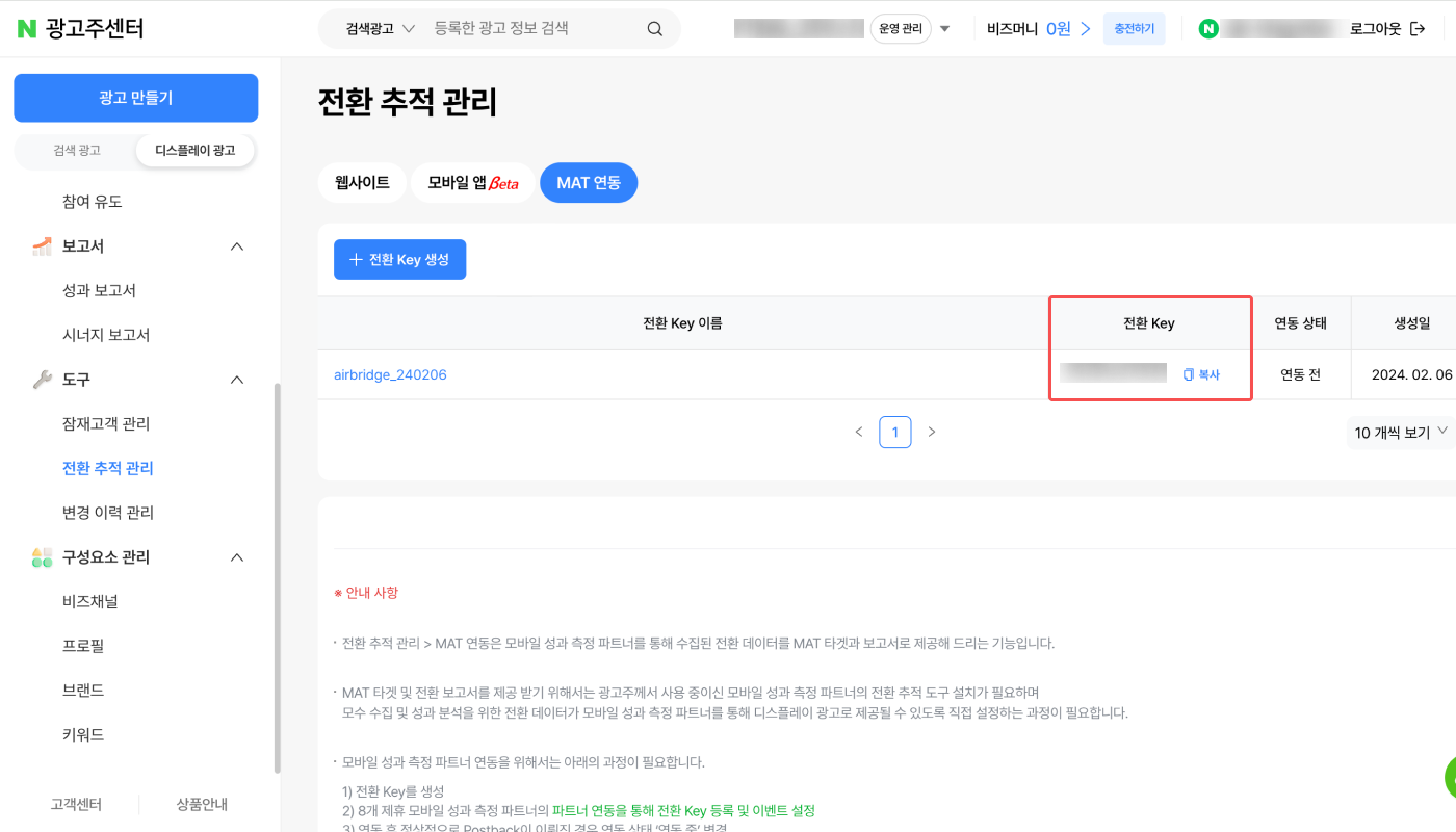 3. 네이버 성과형 디스플레이 광고 대시보드의 [도구]>[전환 추적 관리]>[MAT 연동]에서 ‘전환 Key 생성’을 클릭합니다.