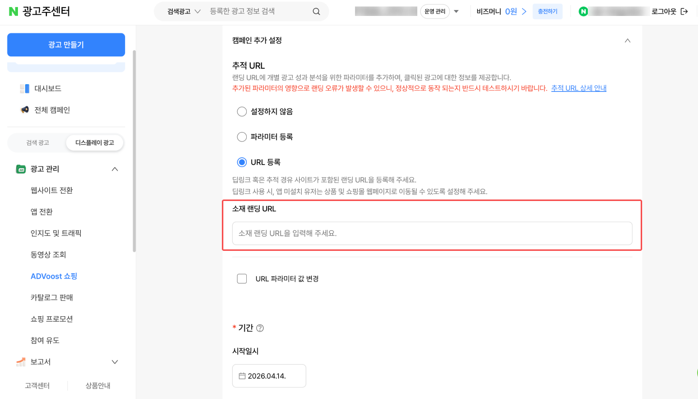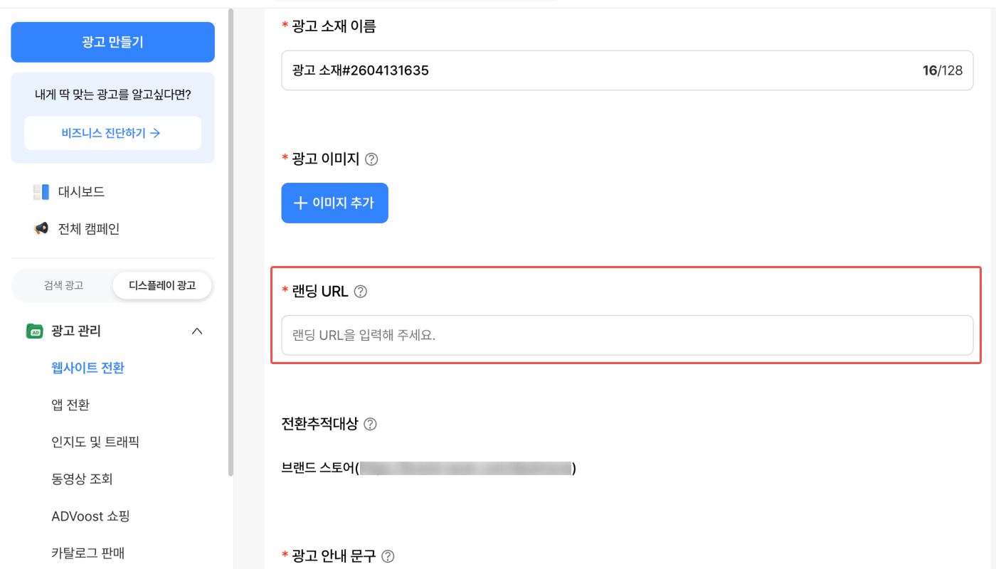 트래킹 링크를 ‘랜딩 URL’에 입력해야 합니다. 트래킹 링크를 ‘대표 URL’, ‘앱 설치 URL’ 등에 입력하지 않도록 주의해 주세요. 또한 네이버 성과형 디스플레이 광고에 입력하는 트래킹 링크의 ad_type은 반드시 click이어야 합니다.
