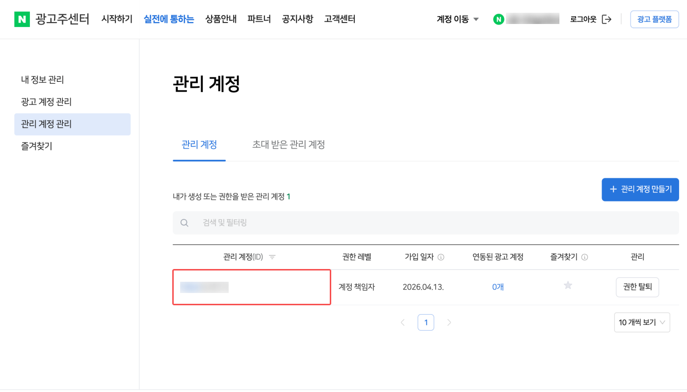4. 비용 연동 설정을 마친 네이버 성과형 디스플레이 광고 계정 이름과 광고 계정 ID를 에어브릿지 CSM에게 전달해 주세요. 광고 계정 이름과 ID는 네이버 성과형 디스플레이 광고 대시보드의 [광고 계정 관리]>[내 광고 계정]에서 확인할 수 있습니다. 담당 CSM이 없는 경우 문의하기를 통해 전달해 주세요.