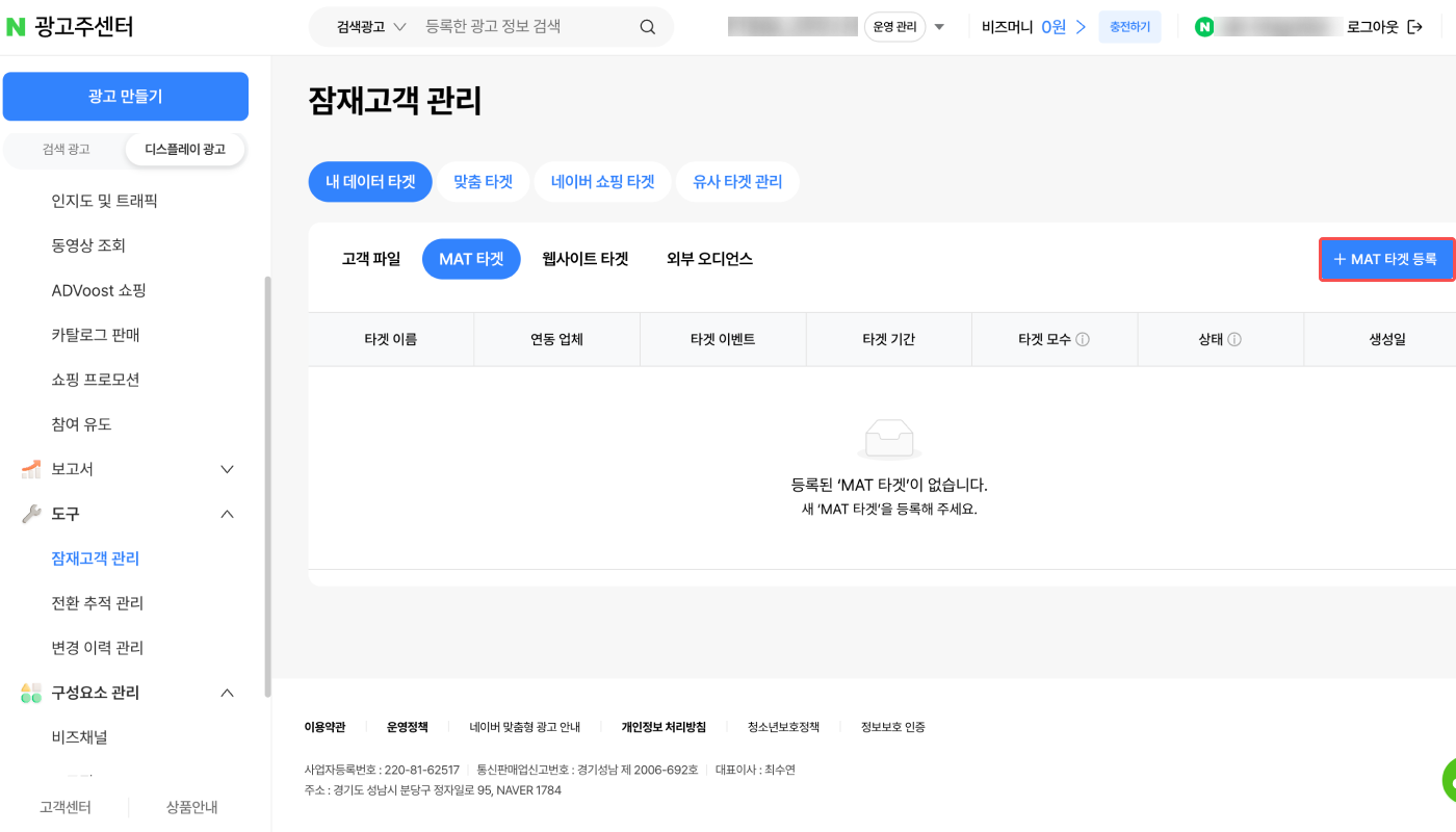1. 네이버 성과형 디스플레이 광고 대시보드의 [도구]>[타겟 관리]>[MAT 타겟 관리]에서 ‘MAT 타겟 등록’을 클릭합니다.