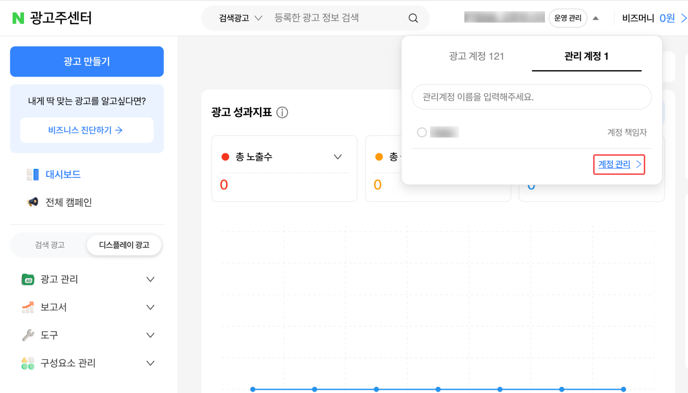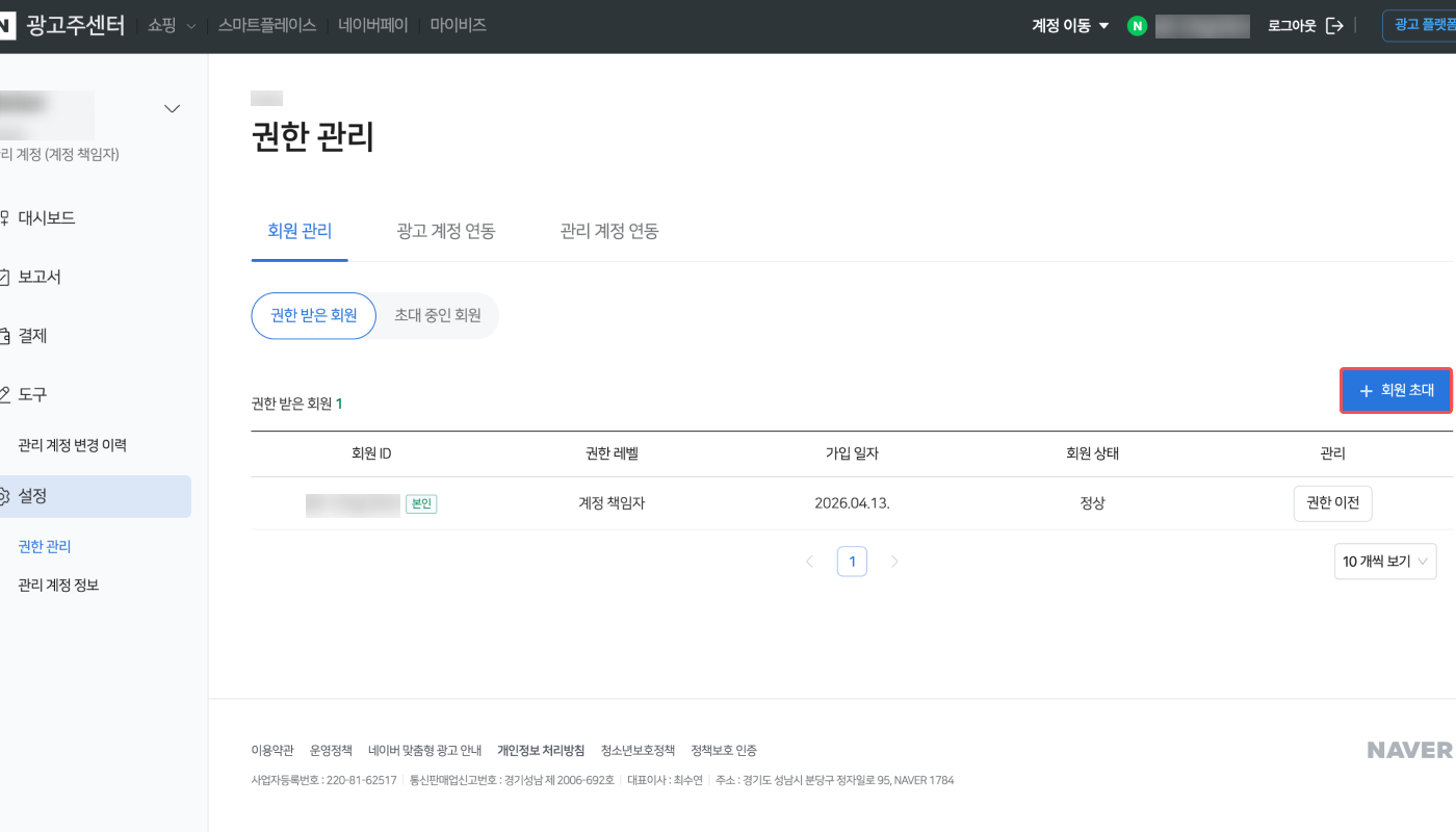 1. 네이버 성과형 디스플레이 광고 대시보드에서 [설정]>[권한 관리]를 클릭합니다.