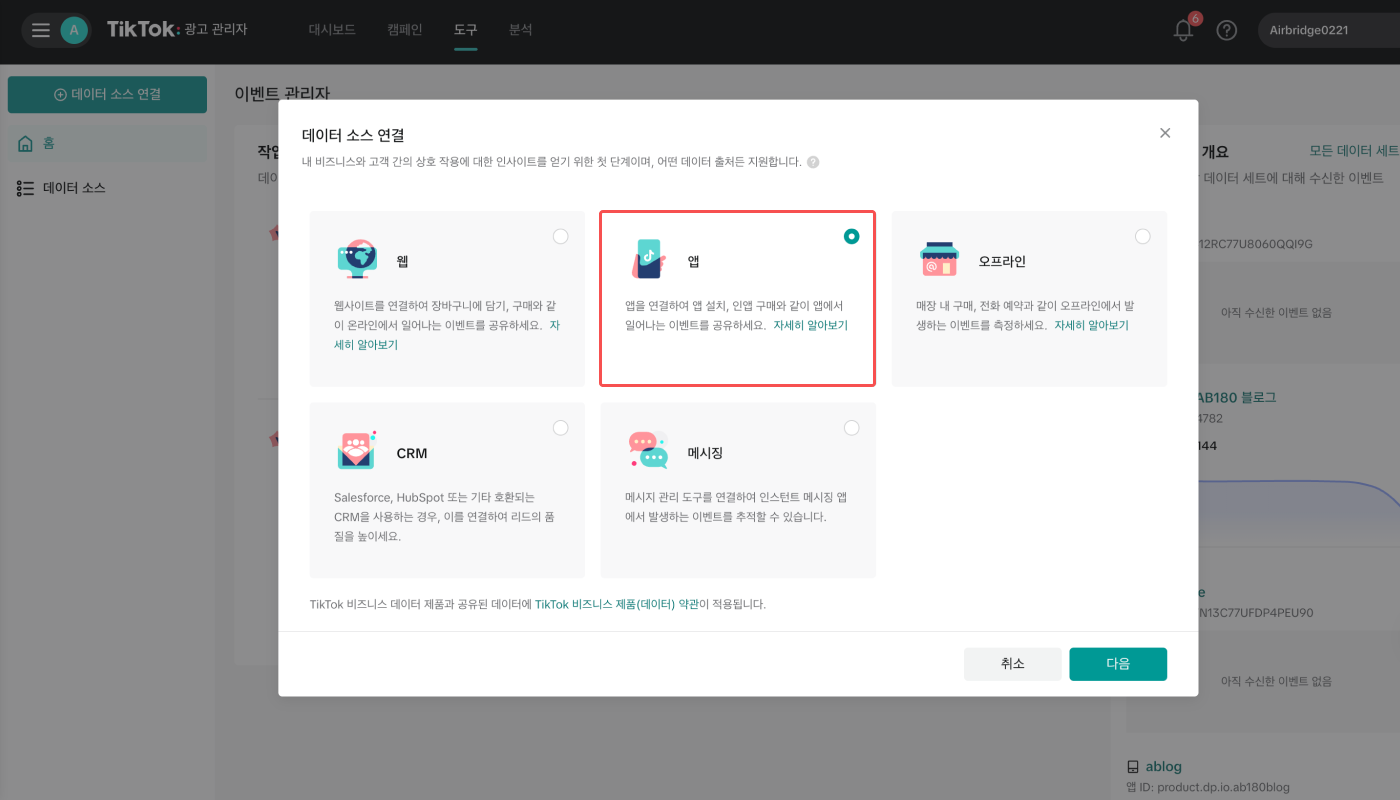 틱톡 광고 관리자(TikTok Ads Manager)에서 에어브릿지 트래킹 링크를 등록하고 앱을 생성해야 합니다.