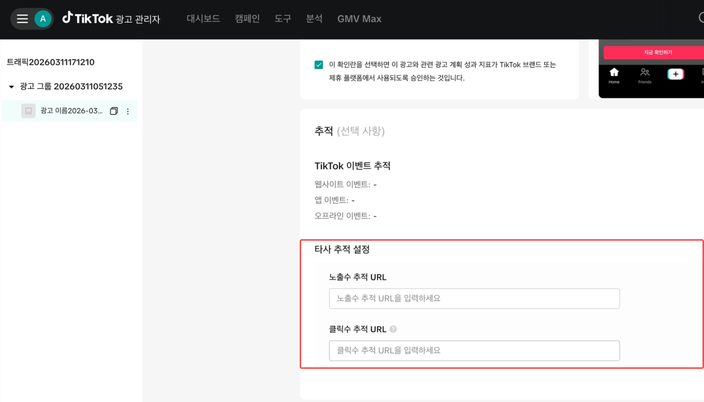 [광고 세부 정보]>[추적]>[타사 추적 설정]에 에어브릿지 대시보드에서 복사한 트래킹 링크를 각각 붙여 넣으세요. 에어브릿지가 제공하는 트래킹 링크는 틱톡 포 비즈니스에 최적화된 형식이므로, 복사한 내용을 수정하지 않고 그대로 입력하세요.