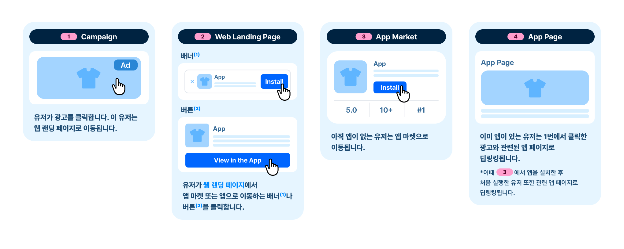 앱을 설치한 후 처음 실행한 유저와 앱으로 딥링킹된 유저는 1번에서 클릭한 광고와 관련된 앱 페이지로 최종 도착합니다.