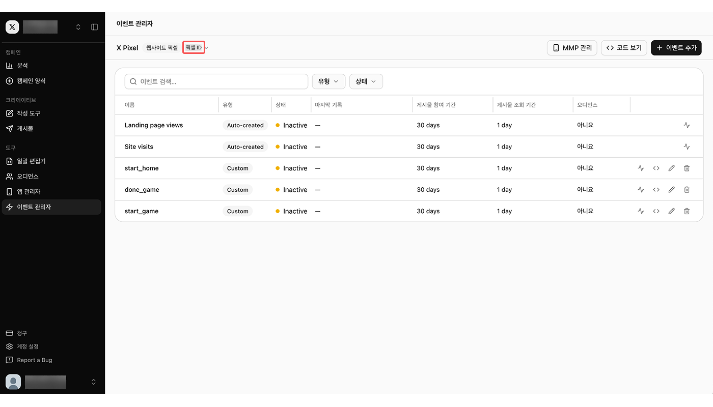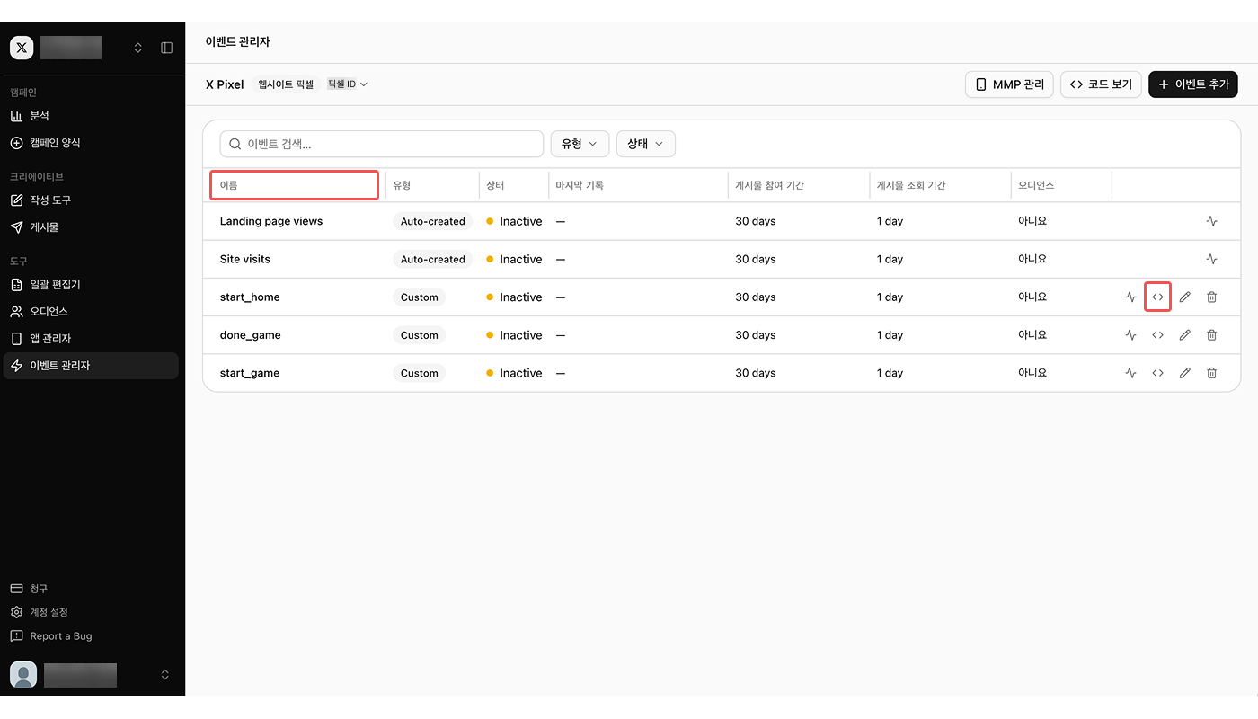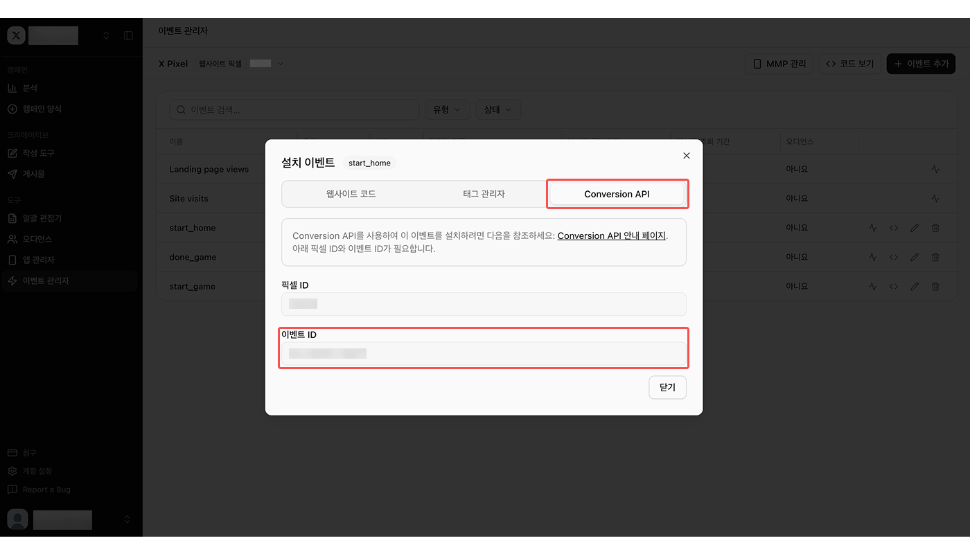 엑스 애즈 대시보드 [도구]>[이벤트 관리자]에서 아래 이벤트 정보를 확인하세요. 이벤트 ID는 이벤트 행 오른쪽의 코드 아이콘 <>을 클릭한 후 ‘Conversion API’ 탭에서 확인할 수 있습니다.