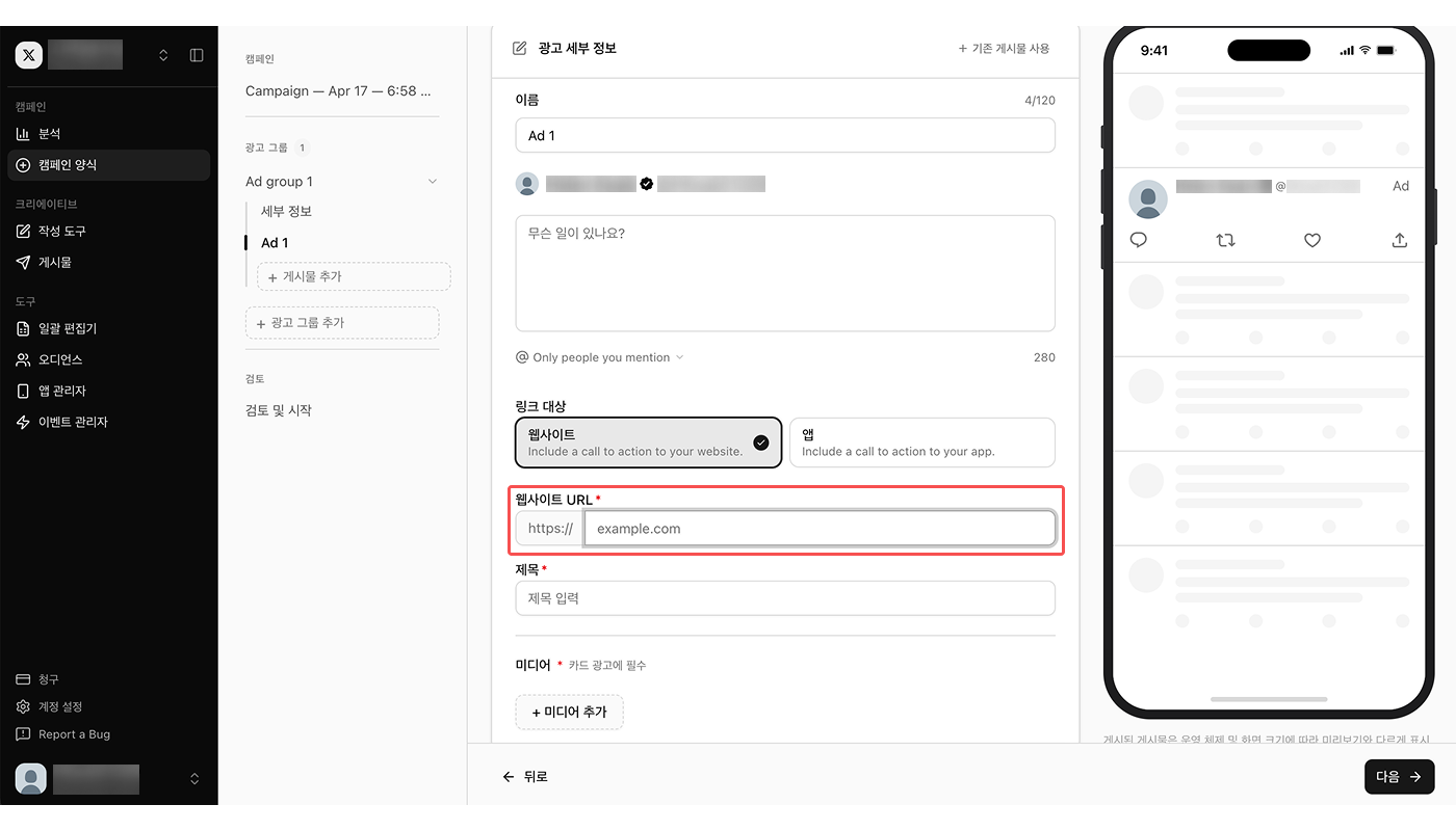 X 대시보드에서 입력한 캠페인, 광고 그룹, 광고의 이름과 에어브릿지 대시보드에서 입력한 트래킹 링크의 캠페인, 광고 그룹, 광고 소재의 이름이 동일해야 합니다. 각 대시보드에 입력한 파라미터의 이름이 다르면 동일한 X 광고 캠페인의 파라미터로 수집한 데이터가 에어브릿지 리포트에서 다른 행으로 나뉩니다. X 대시보드에서 광고 소재의 이름을 입력하지 않으면 에어브릿지는 광고 소재의 파라미터 값에 이름 대신 트윗 URL (Tweet URL)을 제공합니다.