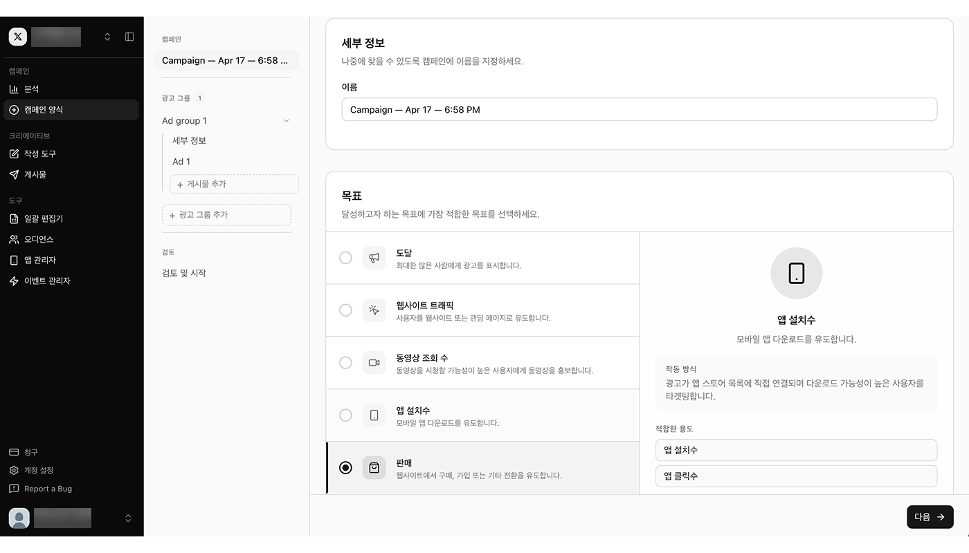 [목표]에서 캠페인 목표를 선택하세요. ‘다음’을 클릭하세요.