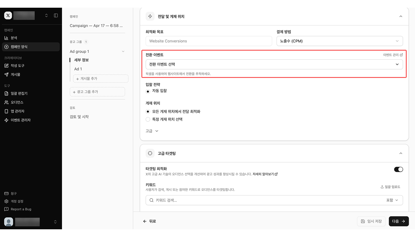 [전달 및 게재 위치]>[전환 이벤트]에서 캠페인 최적화에 활용할 이벤트를 선택합니다. 전 단계에서 에어브릿지에 전달한 엑스 애즈 이벤트를 선택하세요. ‘다음’을 클릭하세요.
