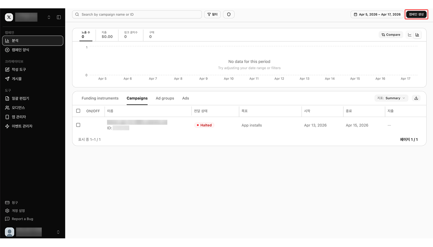 엑스 애즈 대시보드에서 ‘캠페인 생성’을 클릭하세요.